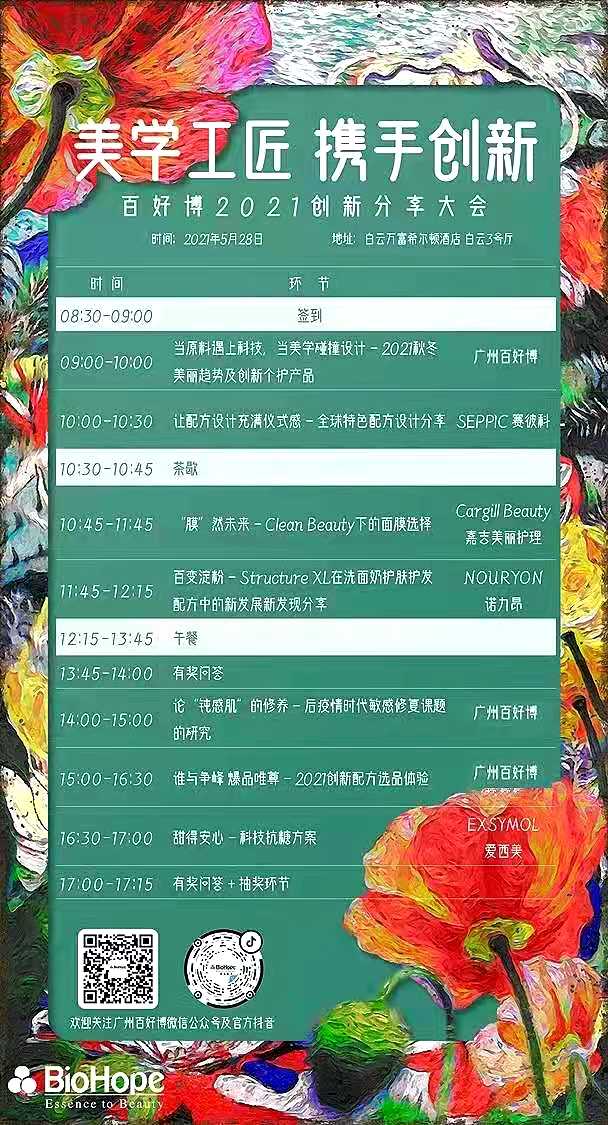 5月28日,百好博携四大原料供应商在广州白云希尔顿酒店举行2021美妆分享大会。欢迎各位的莅临指导。