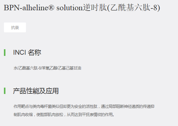 作用靶点与类肉毒杆菌类似但却更为安全的活性肽,通过局部阻断神经递质的传递抑制肌肉收缩,使脸部肌肉放松,从而达到平抚表情纹的作用。