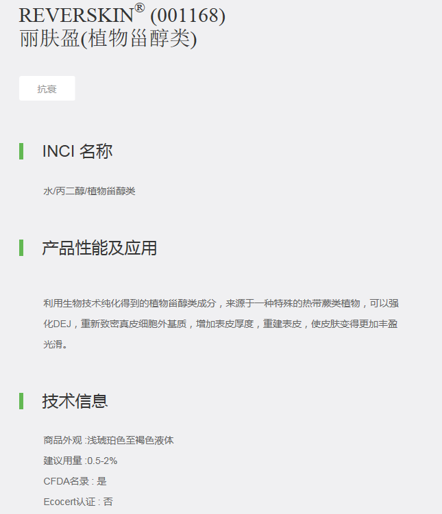 利用生物技术纯化得到的植物甾醇类成分,来源于一种特殊的热带蕨类植物,可以强化DEJ,重新致密真皮细胞外基质,增加表皮厚度,重建表皮,使皮肤变得更加丰盈光滑。
