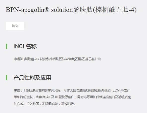 来自于 I 型胶原蛋白前体序列片段,可作为信号肽强烈刺激细胞外基质 (ECM)中成纤维细胞的生长,密集合成 I 及 III 型胶原蛋白,同时亦可增加纤维连接蛋白及透明质酸的合成,持久抗皱,消除静态纹,紧致肌肤。