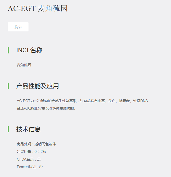 AC-EGT为一种稀有的天然手性氨基酸,具有清除自由基、美白、抗衰老、维持DNA合成和细胞正常生长等多种生理功能。