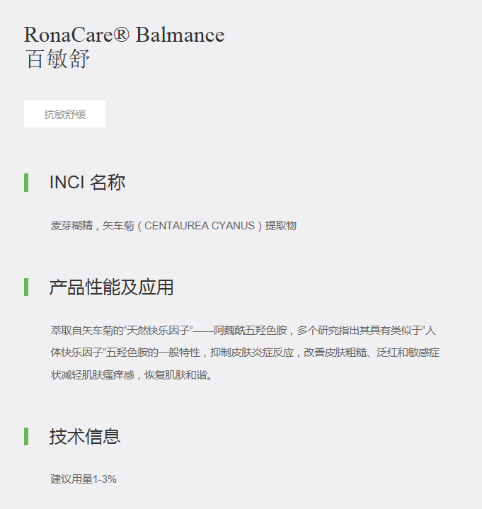 萃取自矢车菊的“天然快乐因子”——阿魏酰五羟色胺,多个研究指出其具有类似于“人体快乐因子”五羟色胺的一般特性,抑制皮肤炎症反应,改善皮肤粗糙、泛红和敏感症状减轻肌肤瘙痒感,恢复肌肤和谐。
