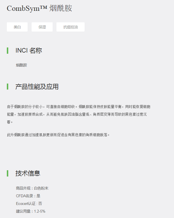 此外烟酰胺通过加速肌肤更新而促进含有黑色素的角质细胞脱落。